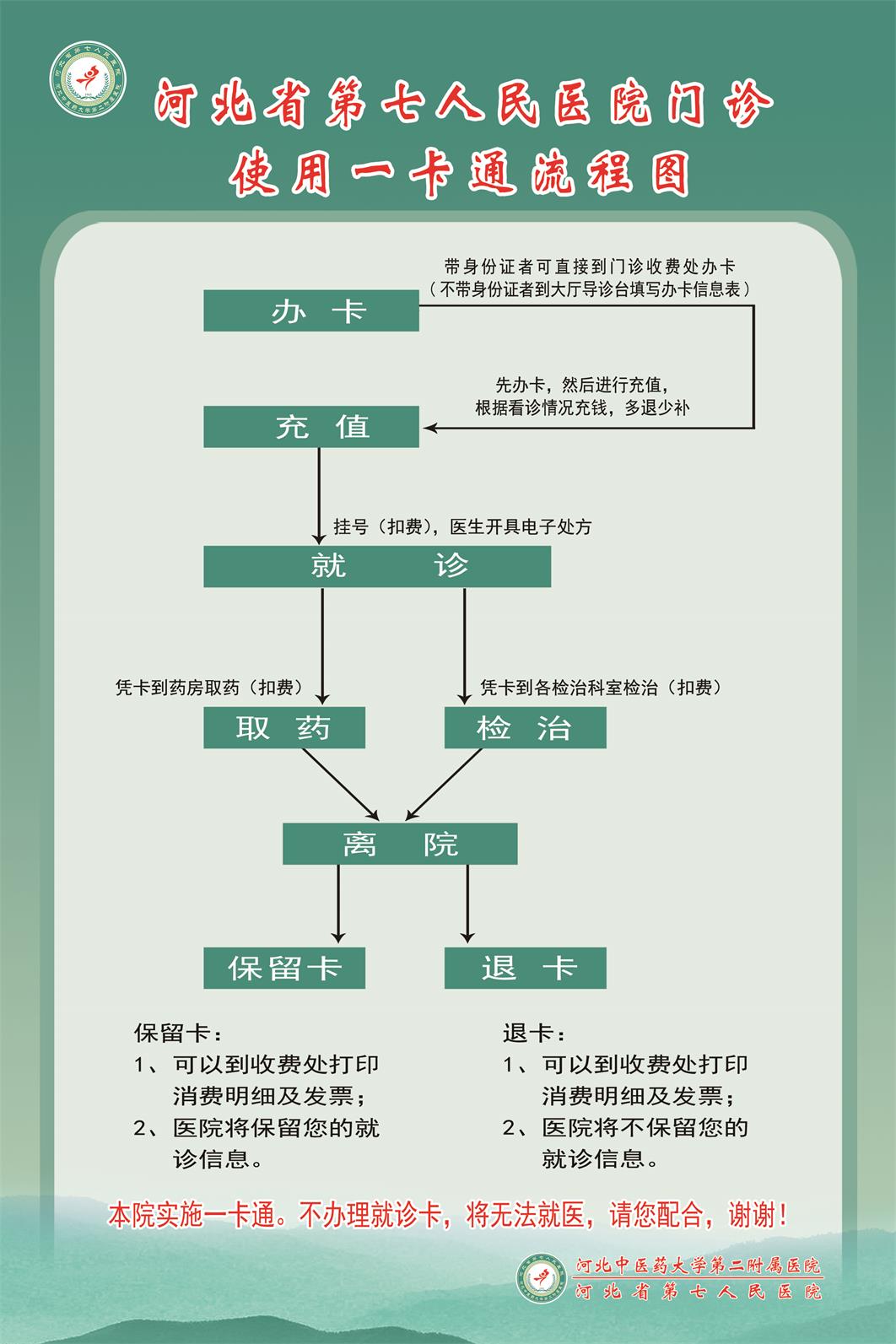 门诊一卡通(门诊预交金模式):就是在就诊时办理一张预存一定金额的就诊卡,就诊时到各费用发生点当场扣费的一种门诊就医模式。