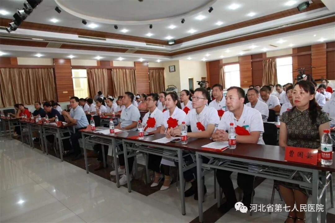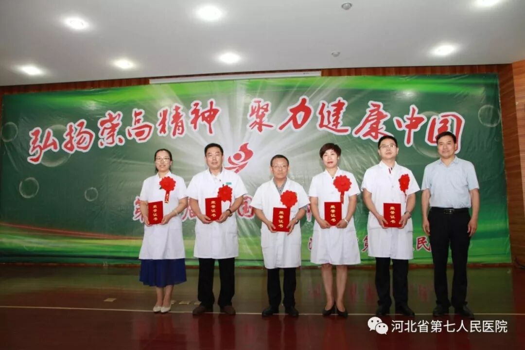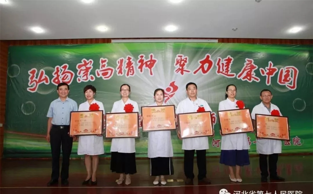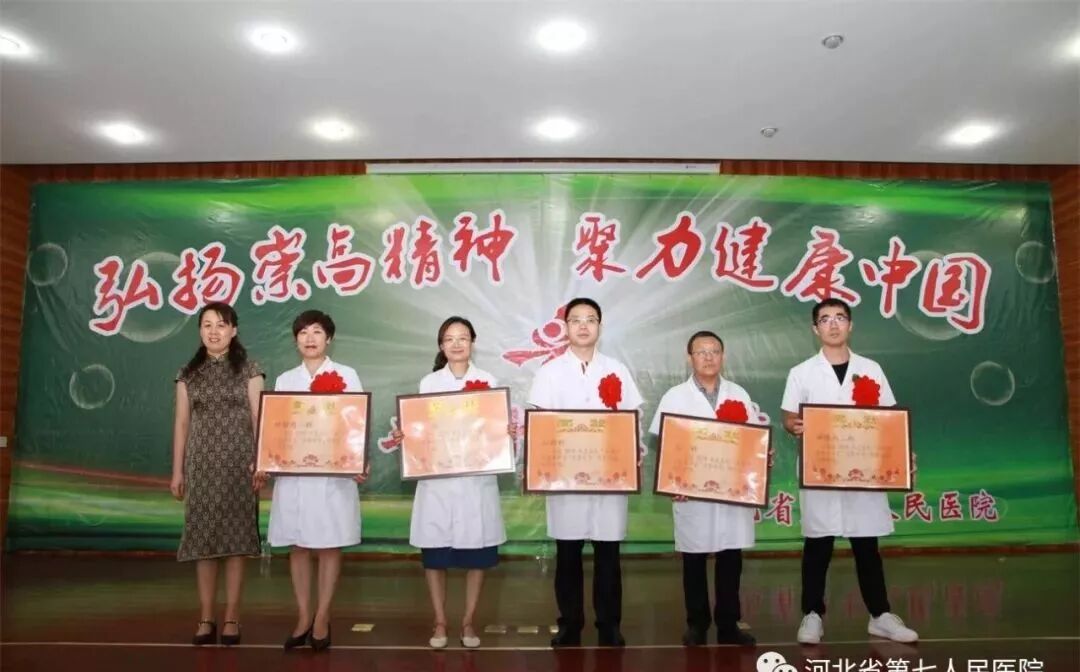 首先,定州市医政药政科贾立丰科长致辞。 他表示省七院广大医师秉承崇高职业精神,辛勤工作在诊室、病房、手术间,奋力拼搏在应急演练和全市重大活动医疗保障现场,维护着人民群众的健康,为定州市健康卫生事业做出了突出贡献。希望广大医务工作者要以习近平新时代中国特色社会主义思想为指导,坚持正确的卫生和健康工作方针,以昂扬的精神风貌,饱满的工作热情,全身心的投入到工作中去。省七院的明天一定更美好!祝愿参加庆祝活动的各位医生:工作顺利,家庭幸福。 副院长任志学领誓,全体医务人员高举右拳,重温《中国医师宣言》。 党委书记杨永利宣读《河北省第七人民医院关于对2019年最美医生等先进表彰决定》。 杨永利为呼吸内科、静配中心颁奖 (呼吸内科任宏伟荣获“2018年度定州市最美医生”。呼吸科孙伟晴医师荣获2018年度"知享呼吸"全国县市级医院慢性气道疾病培训及知识大赛(河北赛区)第一名。 静配中心荣获“河北省药学会医院药学品质管理专业委员会2018年学术年会暨第二届品管圈大赛”三等奖,他们选择的主题是《降低静脉用药调配中心内部差错例数》,最终荣获三等奖。) 任志学为“模范带教科主任”:耿清峰 朱普贤 张玉柱 王建楼 夏丰娜颁奖 安树章为荣获“2019年河北省第七人民医院最美医生称号”的张立元、刘春丽、孙欣娜、贾云朋、金芳、黄晓峰、顾春芳、刘路、高学锋、李红霞10位医生颁奖 曹国芸为在2019年度河北省第七人民医院病历评比中获得优秀管理科室的神经内一科、儿科、心内科、神经内二科、妇科颁奖 安树章为2019年度“医院感控月活动”优秀科室:儿科、手麻科、急诊科、静配中心、产科、神经内一科颁奖 安树章院长向全院医师表达了节日的问候,对本次获奖的优秀医师表示祝贺。他希望全院医务人员,要不断强化为人民服务的本领,勤修医术、提高医技水平,改进医疗质量,不忘初心,牢记使命,做人民满意的医务工作者。 省七院医务人员不仅医疗技术精湛,而且多才多艺,我院为了寻找省七院好声音,举办了“最美医声”歌曲预赛,经评选,6首歌曲进入决赛,在庆祝医师节的现场,展现省七院人好声音的魅力。 (点开下面视频,有彩蛋)