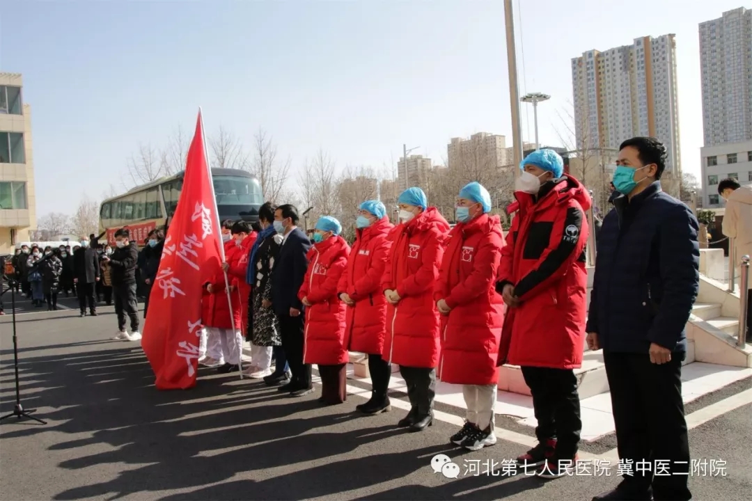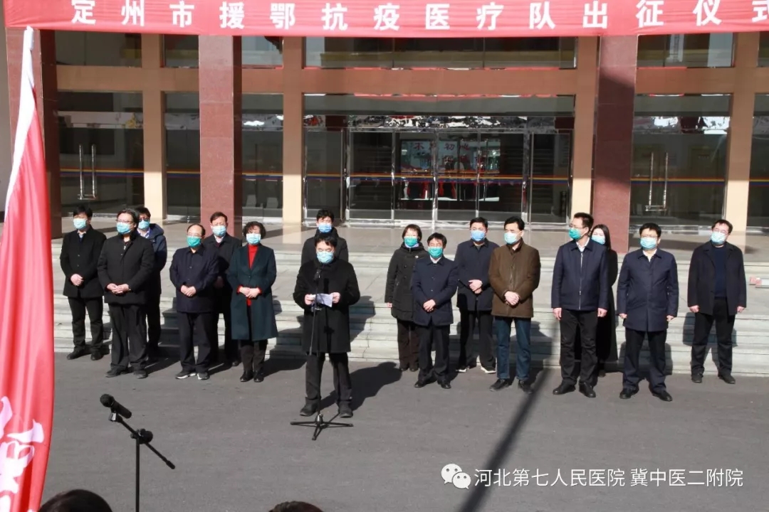 13:30,定州市委书记王东群、市长张涛等领导亲自送省七院、人民医院两所医院组成的10名护理人员医疗队出征。