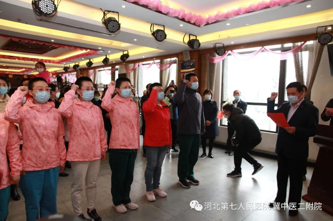 4月1日,是我院支援武汉疫情防控工作的五名护士与驻地定州市人民医院的五名护士胜利凯旋后,解除医学隔离观察的日子。上午8点30分,他们在我院党委书记安树章带领下,面向党旗,高举右拳,庄严宣誓。