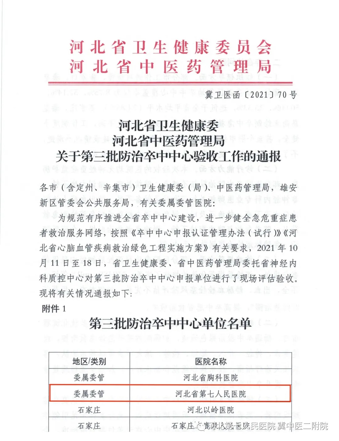 近日,河北省卫健委、河北省中医药管理局联合发文,公布了全省2021年防治卒中中心名单。经过严格审核,河北省第七人民医院(河北中医学院第二附属医院)顺利通过由国家脑防委在全国推动的防治卒中中心认证!.jpg)