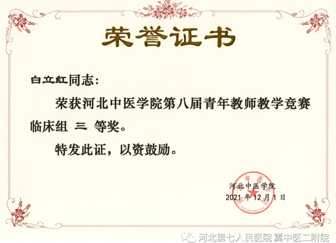 2021年11月,河北中医学院举办了第八届青年教师教学竞赛(临床组)决赛,我院参赛选手脑病二科靳丽丽、急诊科白立红分别展示的《心源性脑栓塞》《慢性支气管炎》教学内容,双双荣获本届大赛临床组三等奖。.jpg)