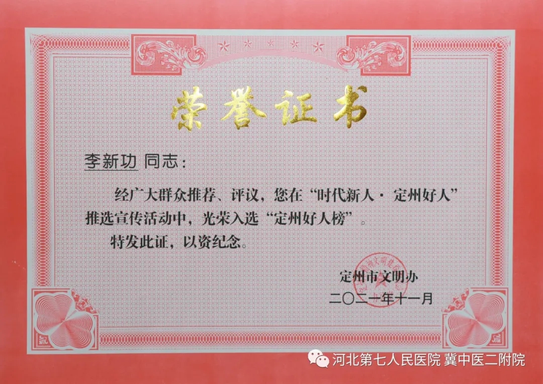 省七院这两位同志荣获定州市 “时代新人·定州好人”