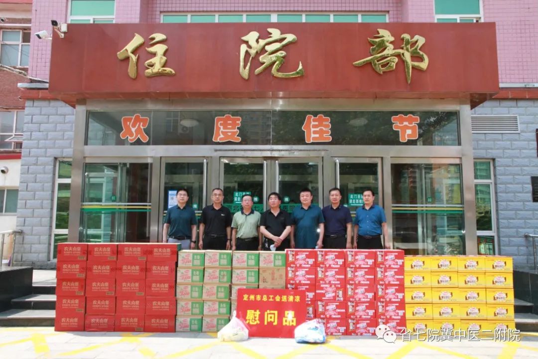 烈日炎炎,骄阳似火。7月8日上午,定州市总工会主席杨晓、常务副主席马立鹏、主任陆立红到省七院,开展夏日“送清凉”活动,慰问临床一线医务人员,并赠送矿泉水、饮料、藿香正气水、白糖、方便面等防暑降温物品,送来了党和工会的关心和温暖。我院党委书记杨永利,院长王鹏,副院长任志学、耿清峰接待。.jpg)