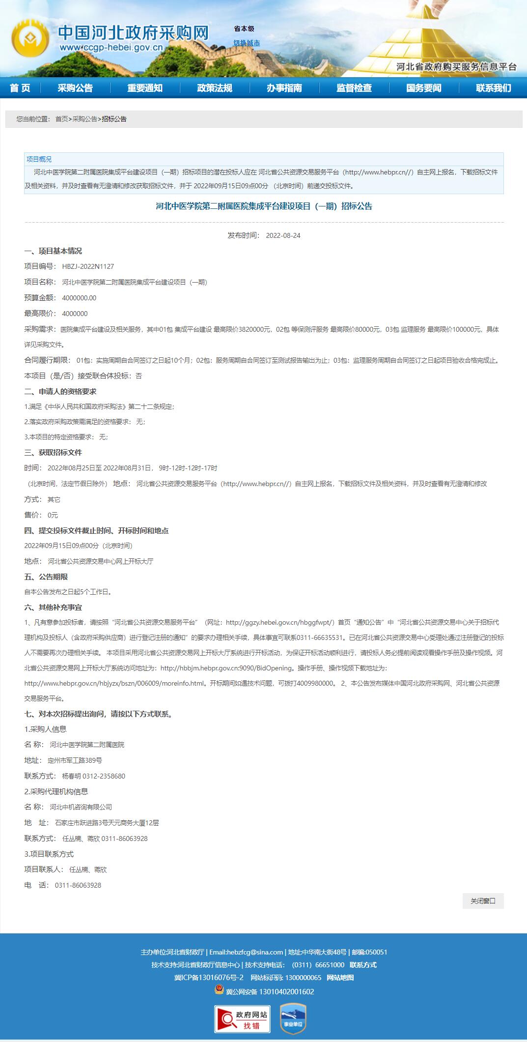 项目名称: 河北中医学院第二附属医院集成平台建设项目(一期)
