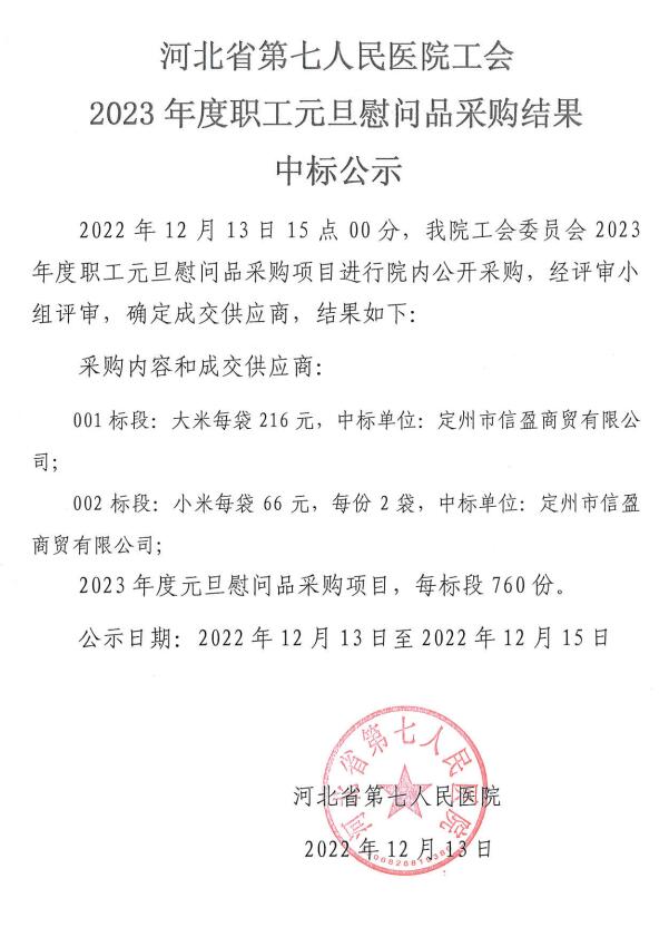 > 医院动态 > 工会2023年度职工元旦慰问品采购结果中标公示