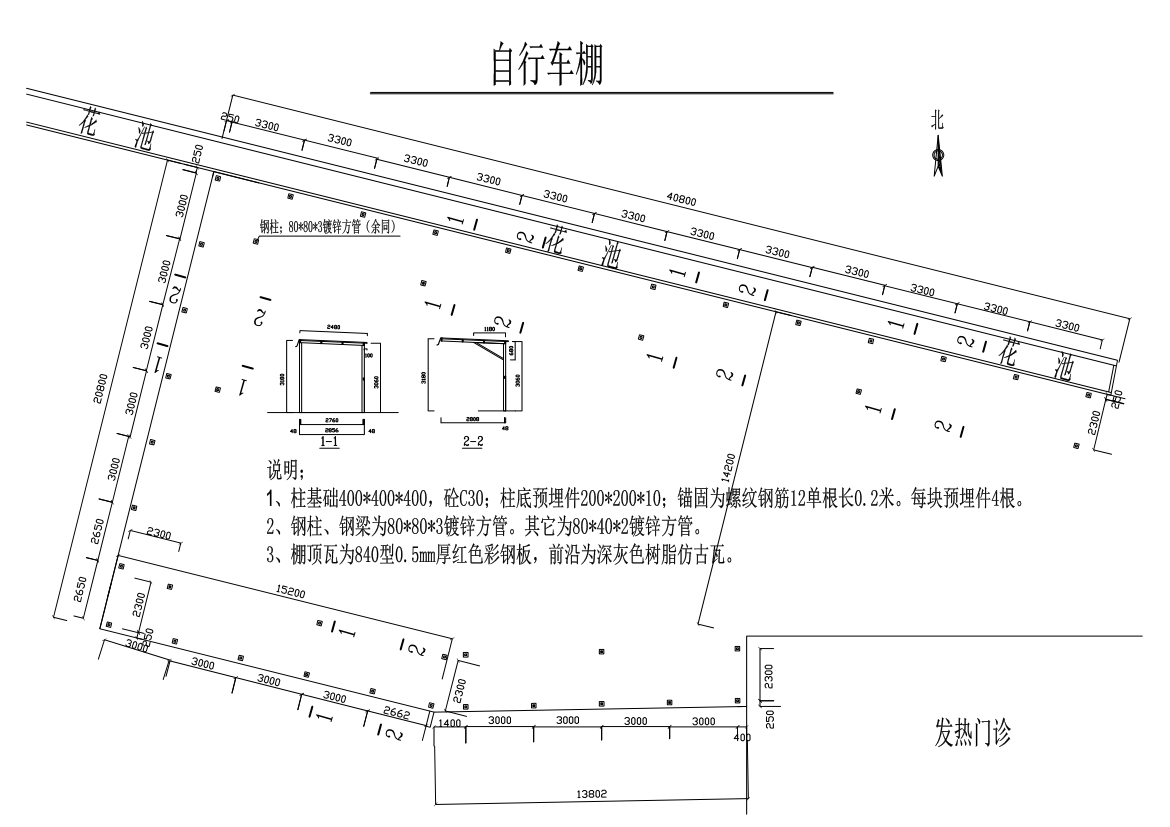 1、自行车棚拆除,包括:拆除车棚、基础墩及清理外运、回填。车棚长度约90.6米,图纸后附。
