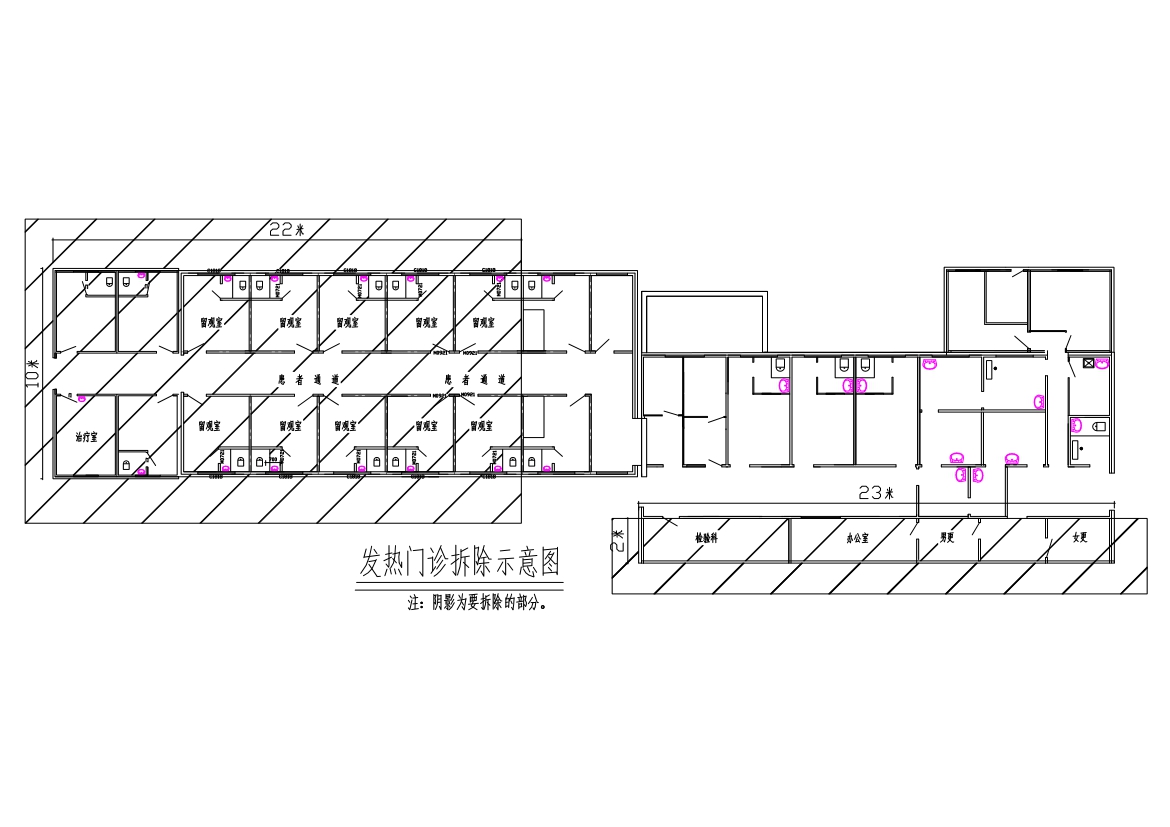 2、部分发热门诊拆除,包括房屋基础及地上部分拆除、垃圾外运,恢复墙体、彩钢板封边。拆除部分面积约266平方米。