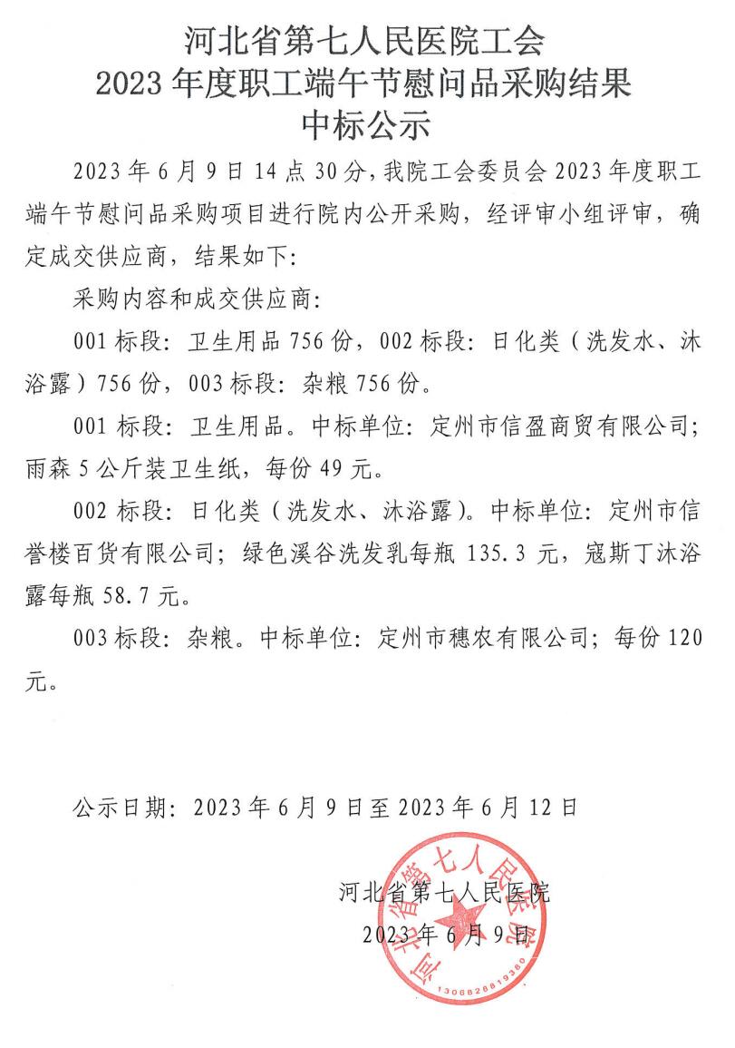 > 医院动态 > 2023年度职工端午节慰问品采购结果中标公示