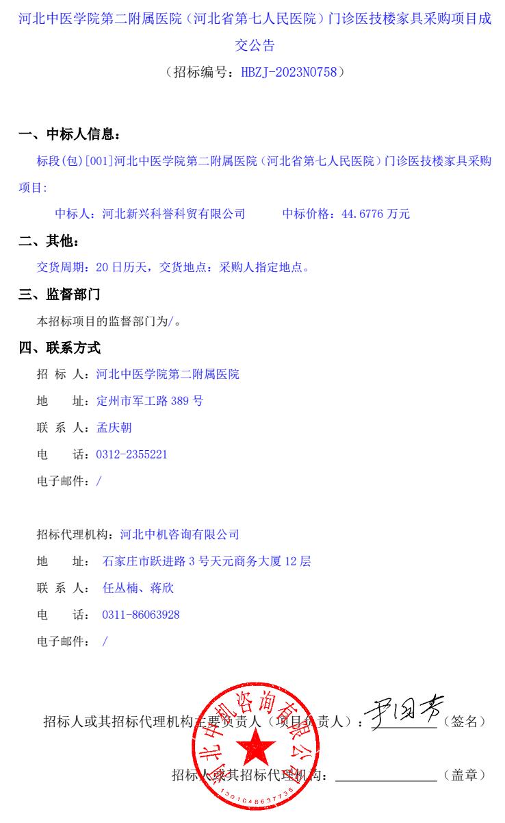门诊医技楼家具采购项目成交公告