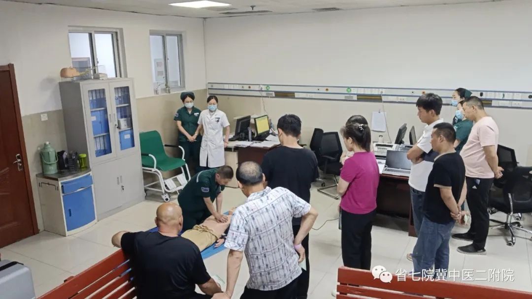 6月5日,急诊科副主任赵向辉对急诊科患者及家属进行心肺复苏的培训;6月6日,急诊科副主任赵向辉对我院保卫科进行心肺复苏培训;6月6日,心血管病科副主任李云贺到曲阳县羊平镇北村进行义诊,并为群众进行了心肺复苏的培训。6月7日,心血管病科副主任李云贺、保健科副主任杨海燕、心血管病科护士长付景走进金域城小区,为群众进行了心肺复苏的培训。