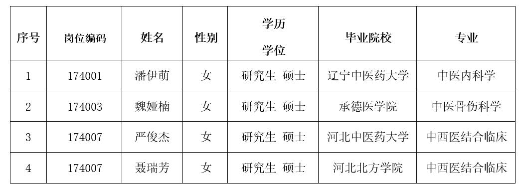 根据《河北省事业单位公开招聘工作人员暂行办法》和《河北省第七人民医院2023年公开招聘工作人员公告》,我院经过资格审查、考试、考察、面试、体检等程序,拟聘用以下4人为我院工作人员,现予以公示: