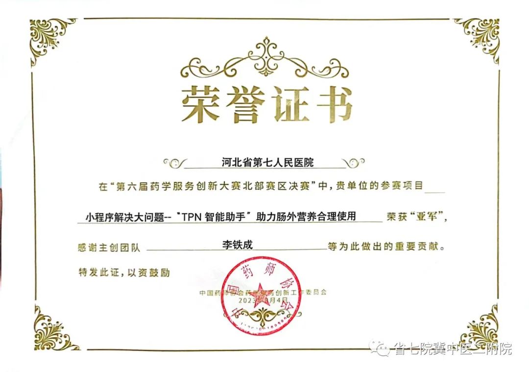 “中国药物服务创新大赛”是由中国药师协会主办的一项全国性赛事,旨在“以赛促创,以赛促学,推进药学服务创新发展”。李铁成药师的创新项目正是来源于日常工作,充分体现了这一宗旨。作为审方药师,李铁成发现肠外营养医嘱因药品种类多,对总热量、热氮比、糖脂比、阳离子浓度等各项指标均有严格的要求,不仅要满足患者营养需求,同时要保证成品液的稳定和用药安全。因此,无论是临床医师还是审方药师,均需花费大量的时间用于计算各项指标,因计算错误或者相关知识欠缺导致的不合理处方也时有发生。为解决这一问题,李铁成潜心自学编程,历经数年努力于2021年7月份开发出第一代《TPN智能助手》小程序,经过数次优化,2023年5月,第二代《TPN智能助手》开发成功并全网发布。《TPN智能助手》可智能匹配患者需求,提供精准营养支持方案,开具及审核医嘱更准确、高效,此款程序同时提供交流平台,用于探讨肠外营养使用中遇到的问题及经验总结,助力肠外营养合理使用。该程序发布以来,已有来自全国多家医院的医师、药师、营养师使用并屡获好评。据不完全统计,截止到7月底,累计用户1550人,注册用户730人,累计访问页面2.91万次。