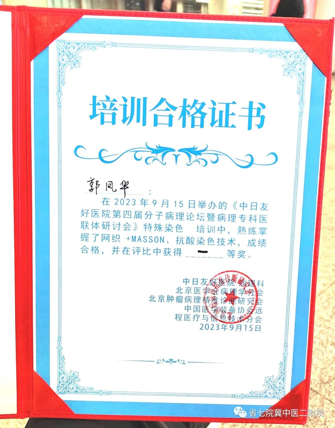 在本次活动中,还组织了技术人员的特殊染色培训和比赛,每家能开展特殊染色工作的医联体单位都选派一名经验丰富的技术人员参加。我院的病理主管技师郭凤华熟练掌握网织+MASSON和抗酸染色技术,并在比赛中获得了“一等奖”。.jpg)