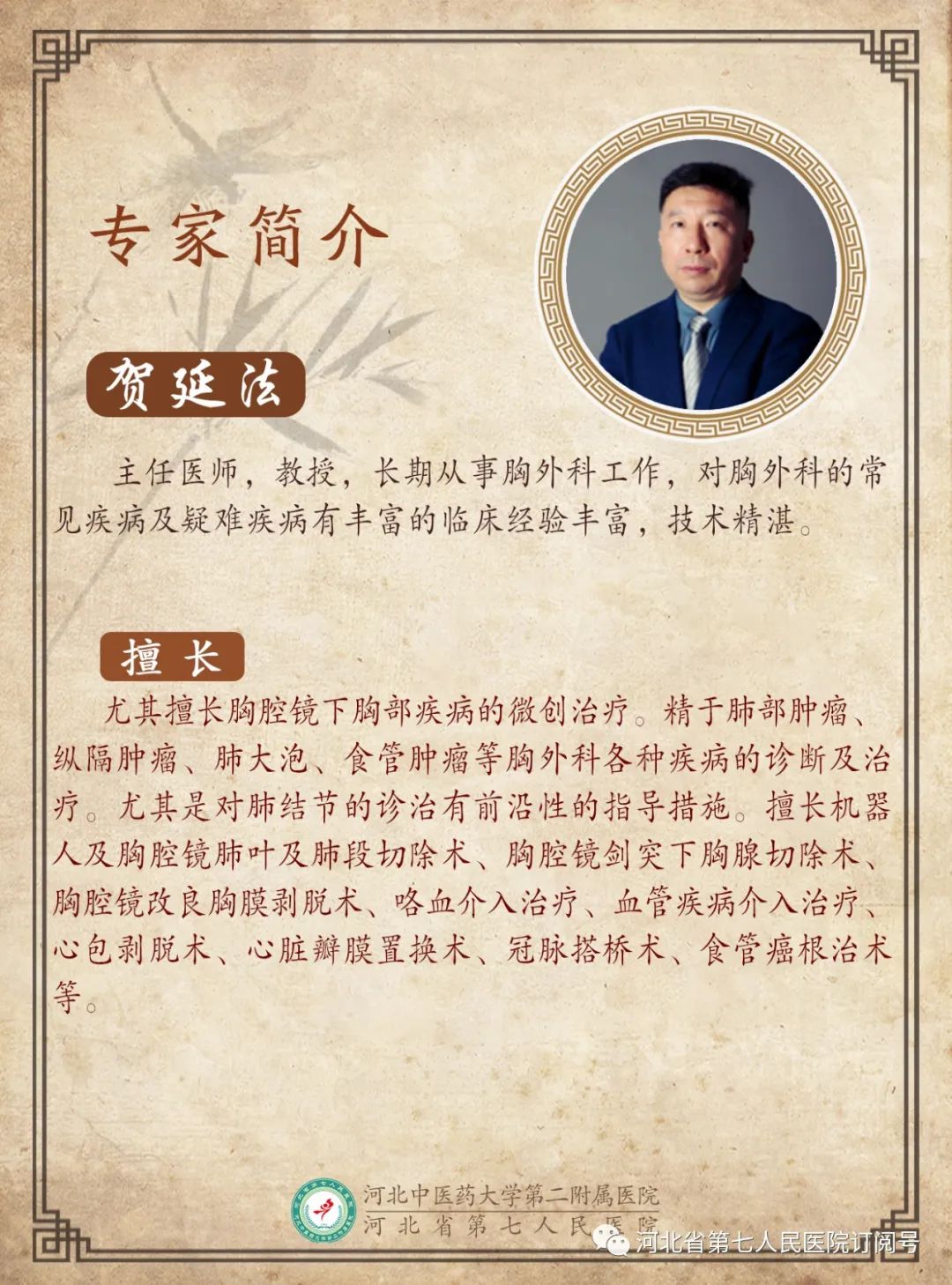 河北省第七人民医院外二科为了更好地服务于人民大众,使广大胸科疾病患者在家门口享受到省级专家的服务,特聘请了河北省胸科医院胸外科专家贺延法教授定期来我院坐诊。