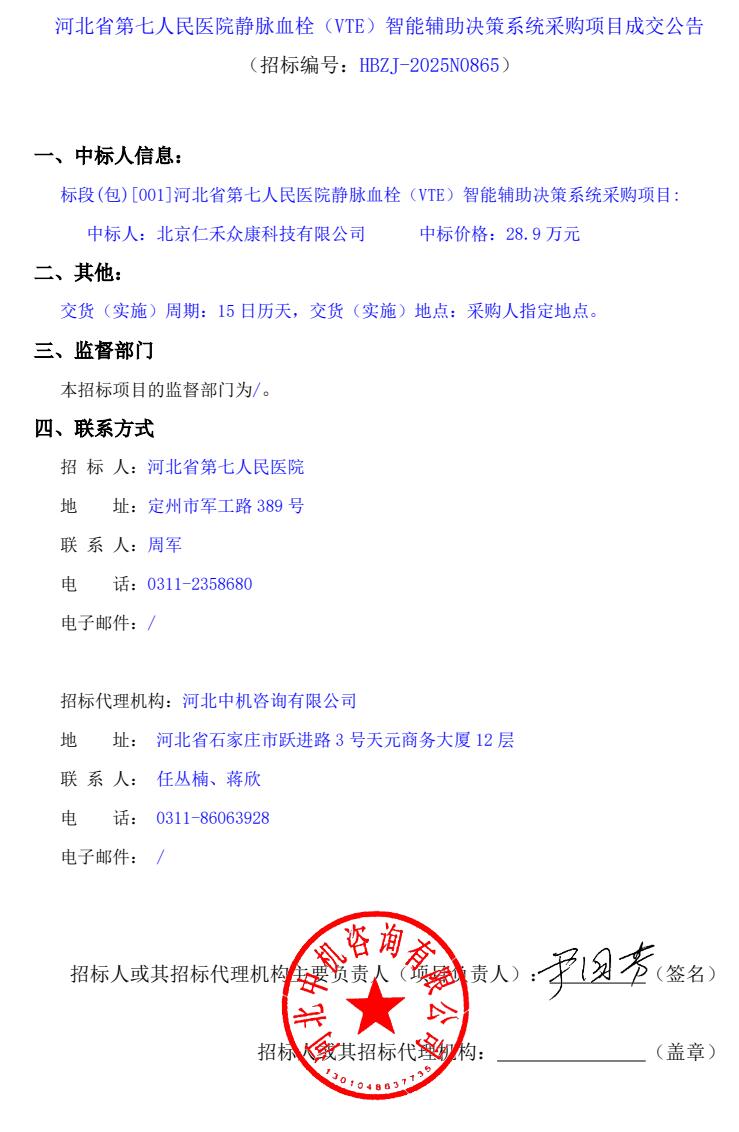 静脉血栓(VTE)智能辅助决策系统采购项目成交公告