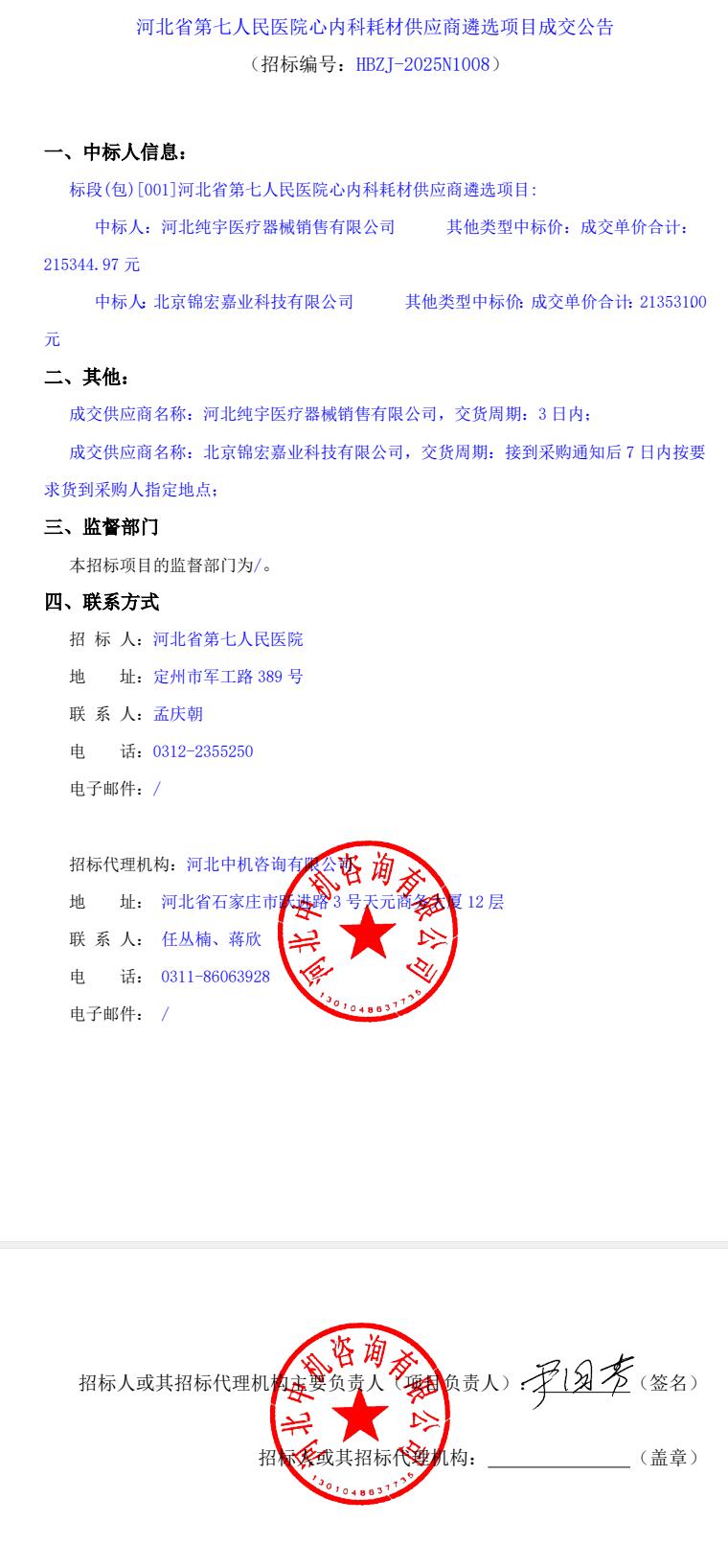 心内科耗材供应商遴选项目成交公告