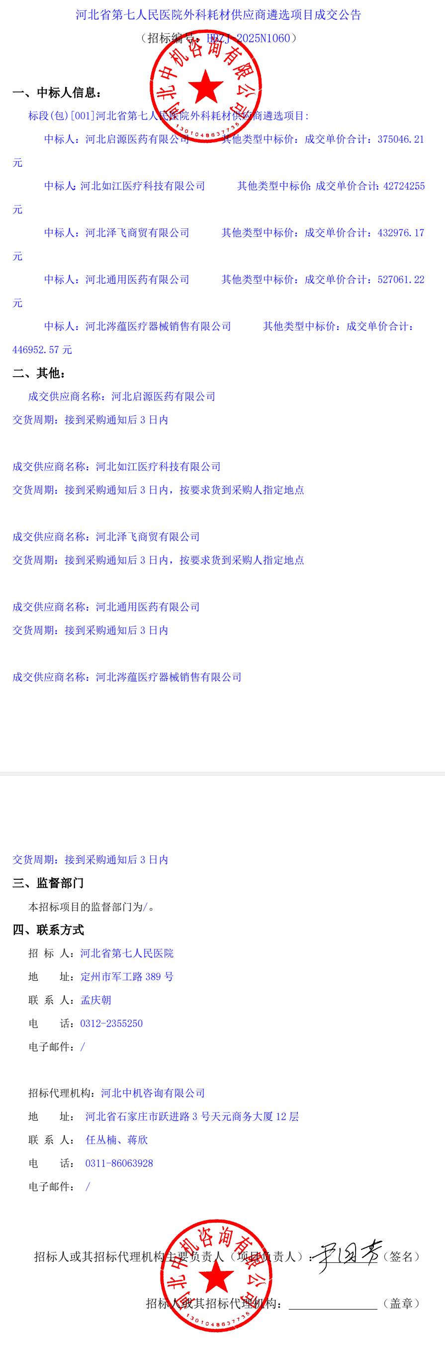 外科耗材供应商遴选项目成交公告