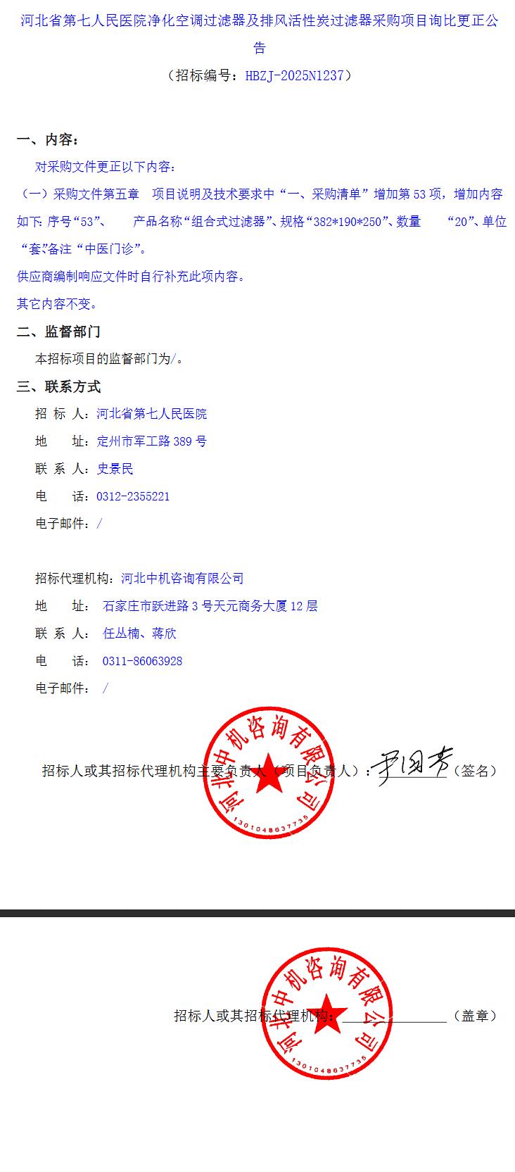 净化空调过滤器及排风活性炭过滤器采购项目询比更正公告