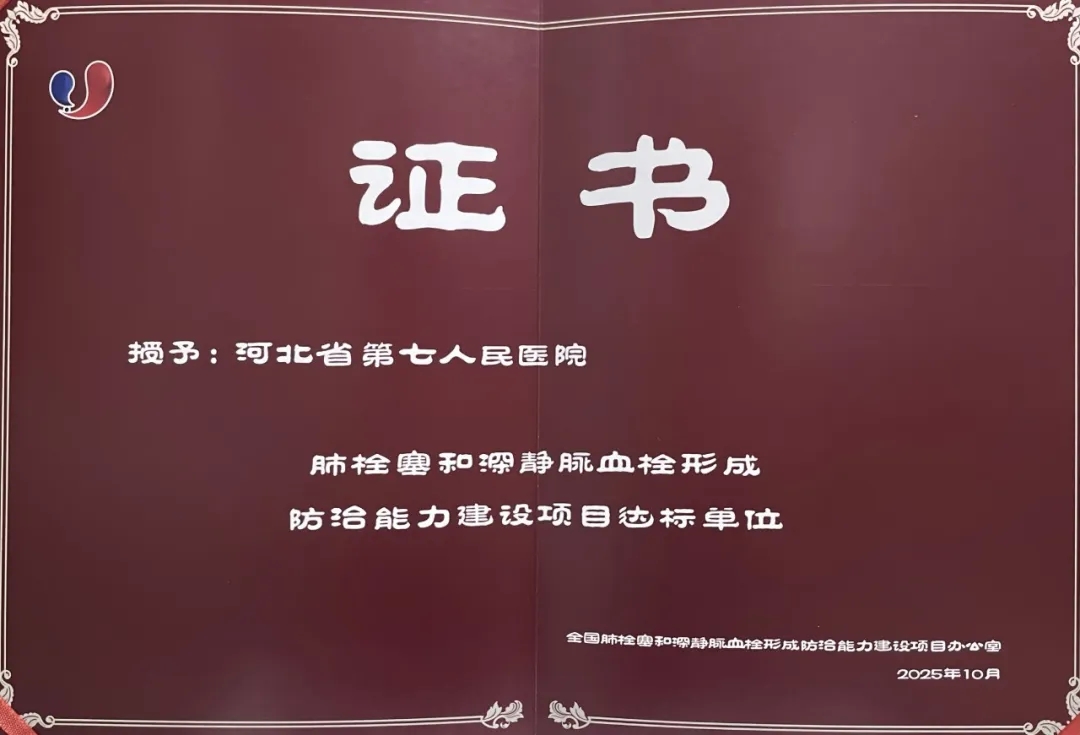 10月31日,2025年中国VTE大会在北京召开,国家项目办公室在大会上公布了评审结果,河北省第七人民医院获评国家VTE防治项目达标单位。这一成果不仅标志着省七院在VTE预防、诊断与治疗全流程建立起科学规范的防治体系,更意味着医院医疗质量与安全建设迈入全新发展阶段。.jpg)