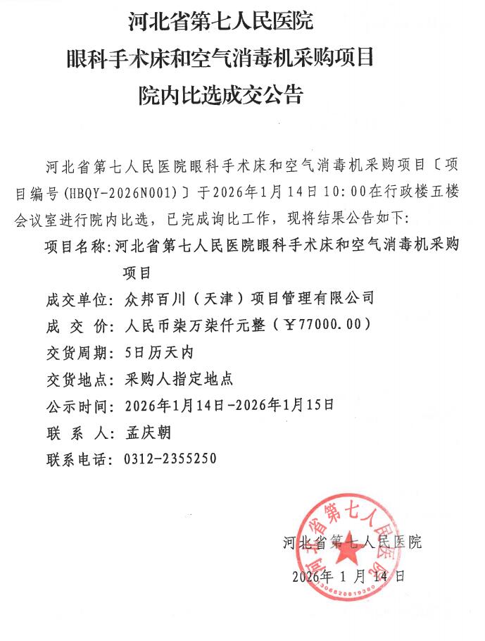 眼科手术床和空气消毒机采购项目院内比选成交公告