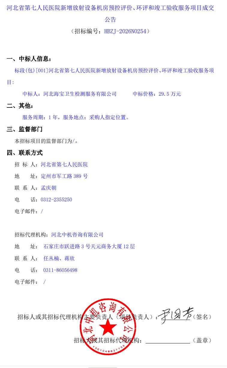 新增放射设备机房预控评价、环评和竣工验收服务项目成交公告